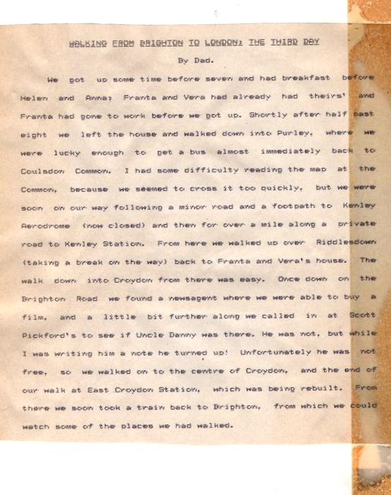 In the early nineties Philip, Julia and I walked first from Brighton to Croydon, then from Croydon to Westminster, from there through West London to Windsor, Reading and eventually to very near Swindon. Here are the pages of our log to Croydon: